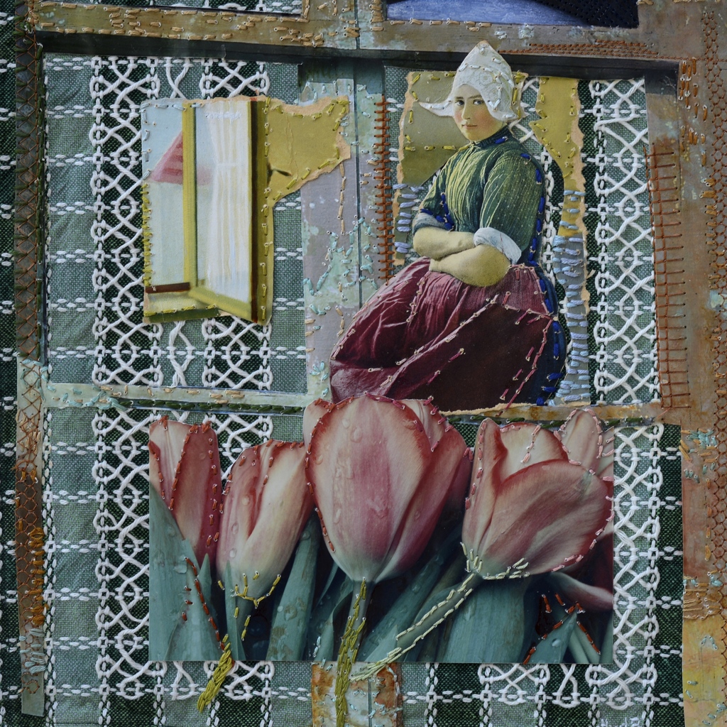 Ik ben een materialen mens, en maak samenvoegingen van verschillende materialen; foto’s, stoffen en borduursels, soms ook gecombineerd met hout, lood en steen, op wisselende formaten