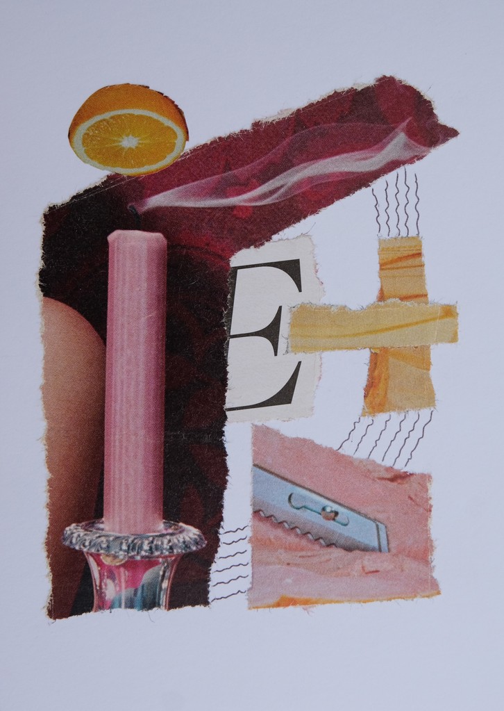 "Plaats de E centraal / en een aantal items / in een losse maar / zinderende verbinding." (papieren collage, particuliere collectie)