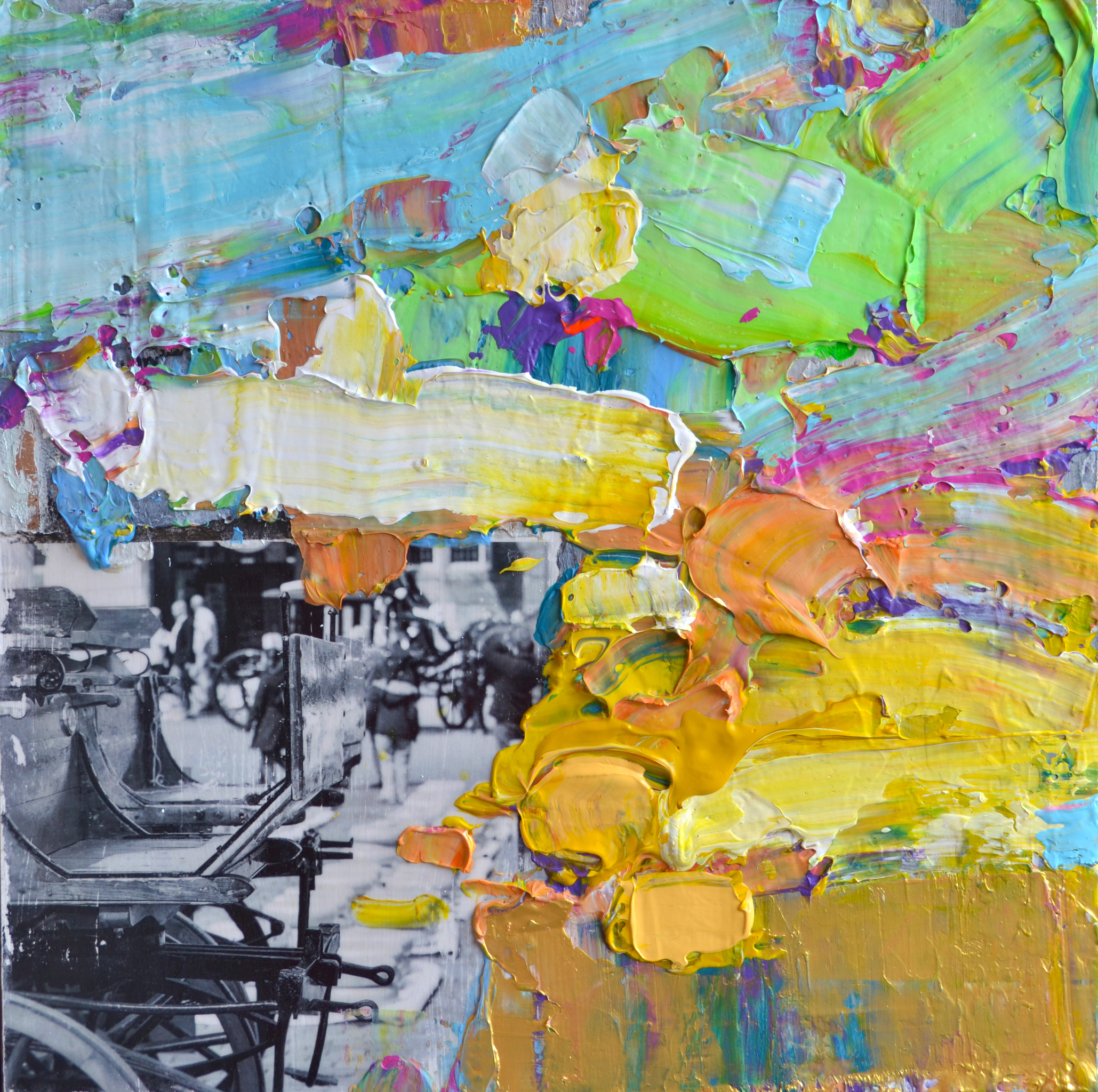 Local farmers and cheese makers gather in the square to sell their Gouda cheeses directly to consumers. The event aims to recreate the historical trading and weighing of cheeses that has been taking place in Gouda for centuries. The Painting is a mixture between different materials, photography, acrylic paint and mediums. The photograph has been transferred onto the panel and then combined with golden paint and colourful heavy textures. The panel has sides with depth of 9 cm.