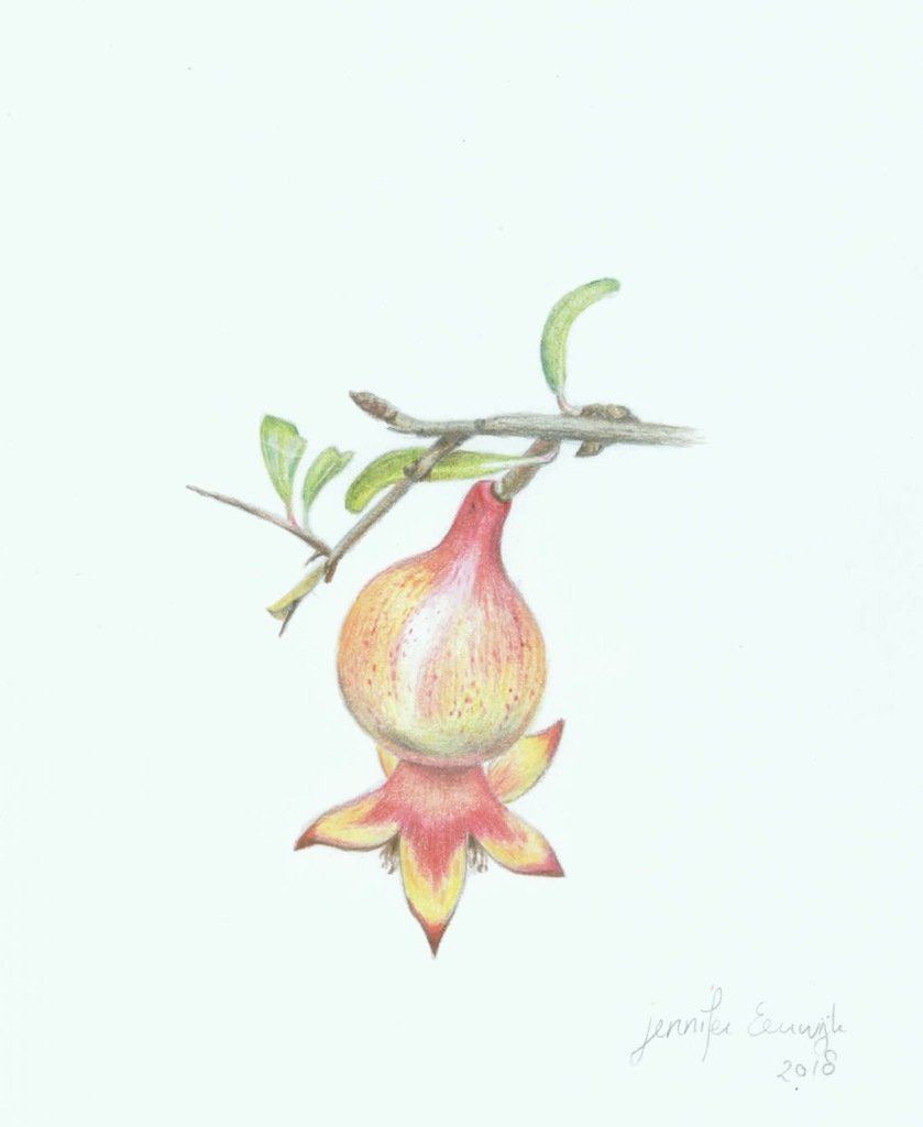 Kleine tekening van kleinsoortige granaatappel, met kleurpotlood.