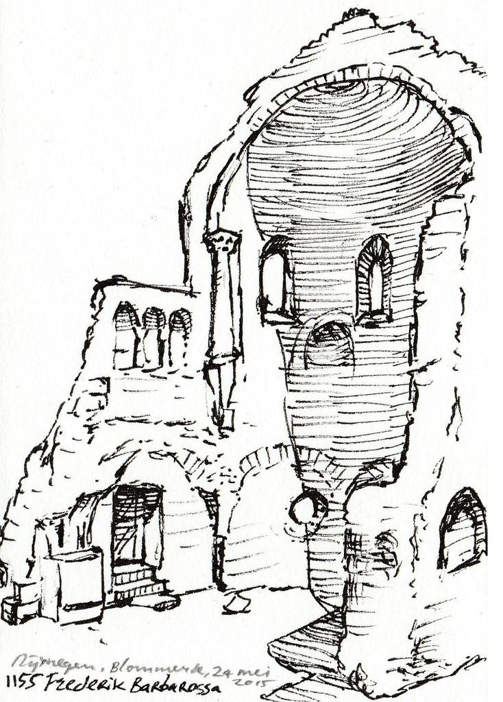 Kleine pentekening van de Barbarossa ruïne in Nijmegen