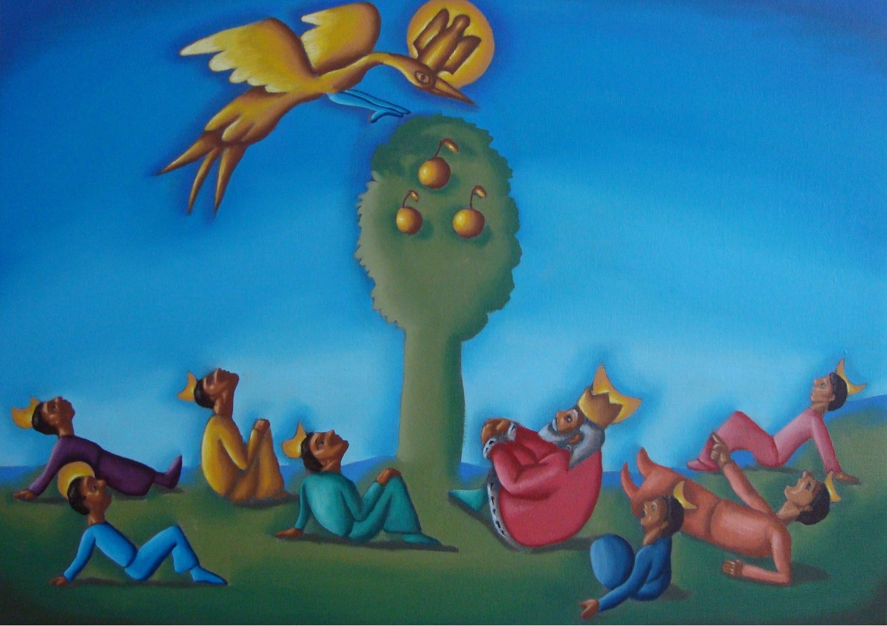 Schilderij naar het Swahili sprookje van Binti Matlai Shemshi waarin de jongste prins een wonderlijke vogel vangt