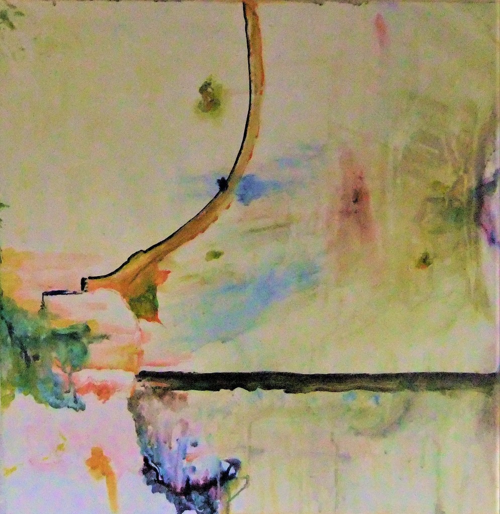 Soort experiment om eens een heel klein schilderijtje te maken.Hoe gaat dat, wat kom je tegen, hoe ga je om met een veel kleinere ruimte dan ik gewend ben, kan ik daar tegen, wat gebeurt er dan? Het is gelukkig goed gegaan en resultaat is eenvoudig maar wel mooie kleuren en afwisselende lijnen.