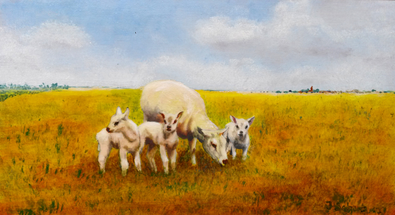 Klein schilderij van een weids, zonnig landschap met schapen.