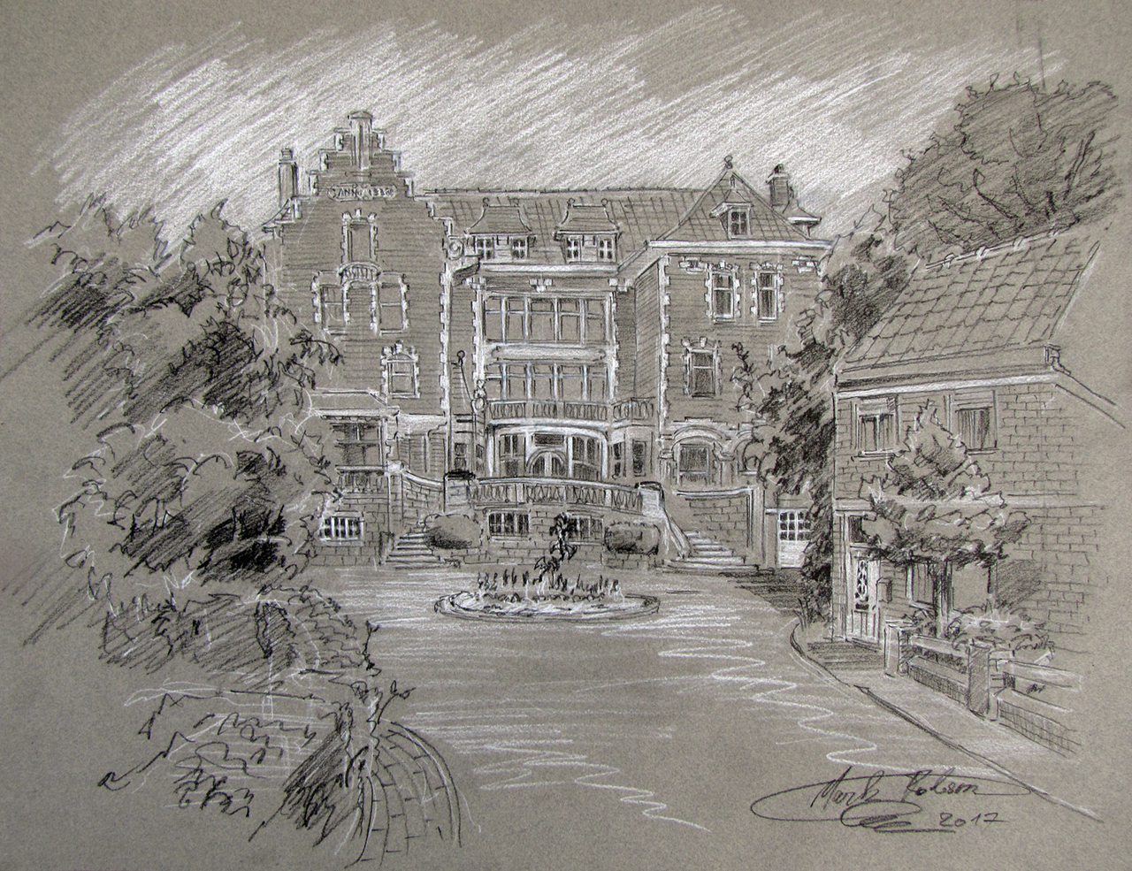 Koksijde - Hotelschool "Ter Duinen" - Oorspronkelijk een gebouw van de "Vrije Mijnwerkers van Limburg" (1938), in neo-Vlaamse renaissance-stijl. Maakt nu reeds jaren deel uit van de vermaarde Hotelschool Ter Duinen. - Juli 2017 - Pastelpotlood op Cansonpapier.