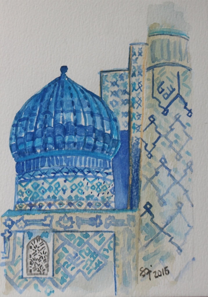 De koepels van veel moskeeen in Centraal Azie, zoals ook deze in Samarkand, Oezbekistan, zijn versierd met prachtige blauwe tegels