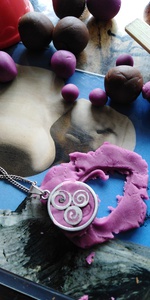 Werk no.5 in de serie "Outerworld". Handgeknipt keramiek uit gerecycled keramiek van Emaux de Briare op leisteen. Er zijn knoopjes en kralen in verwerkt die dateren uit de beginjaren van de fabriek zo'n 150 jaar geleden.