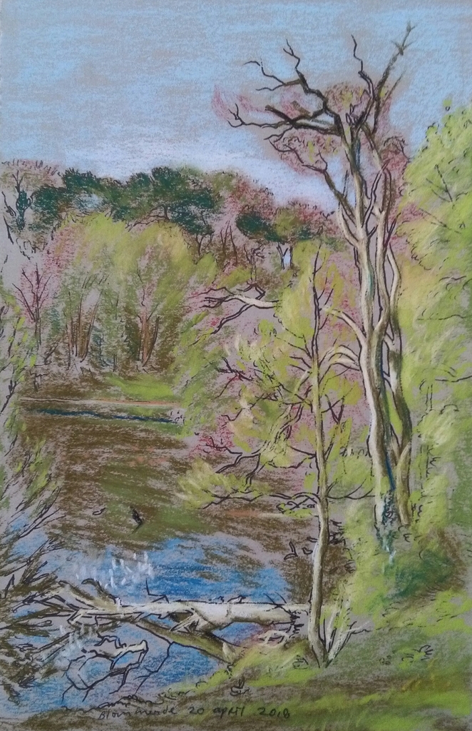 Bos Landschap Bomen Waterpartij Figuratief Realistisch Natuur Pastel Tekening