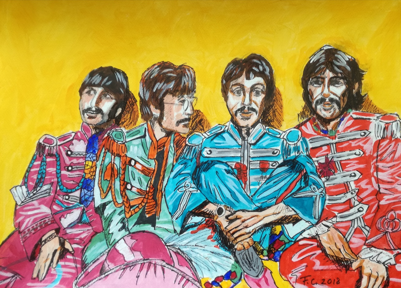 Sgt. Peppers Lonely Hearts Club Band. Schets/tekening op aquarelpapier ingekleurd met acryl verf.
