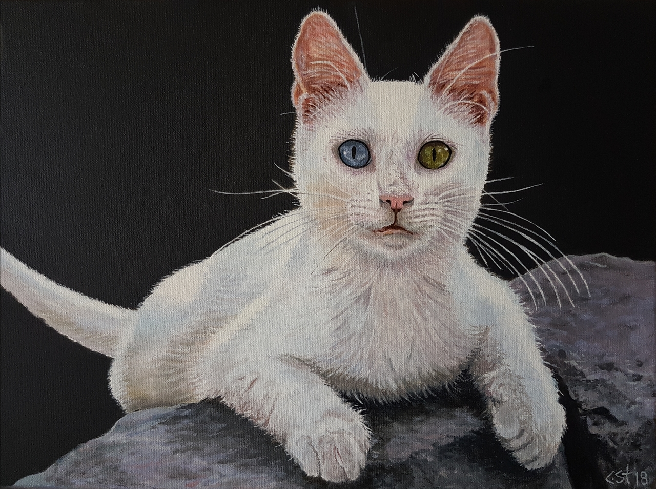 Poes Kater Wit Donker Grijs Blauw En Geelgroen Oog Realistisch Olieverf
