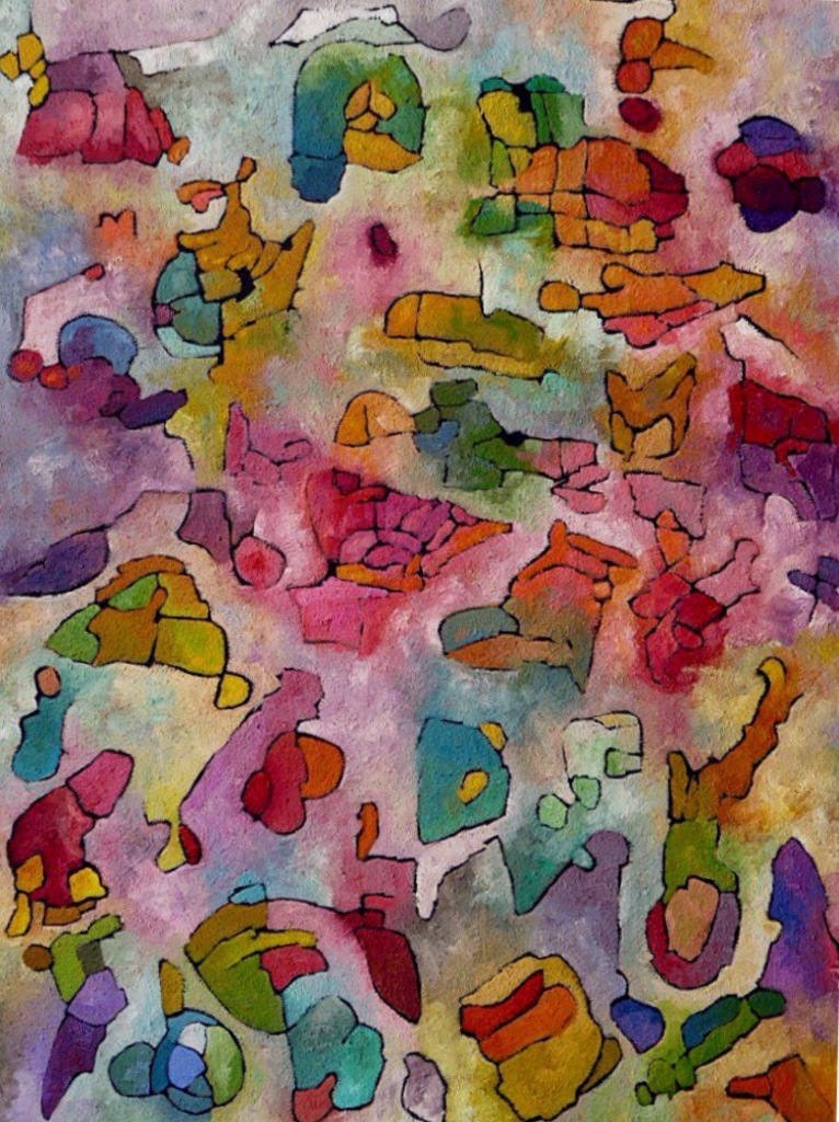 Abstracte schilderijen en dito beschilderde objecten in een stijl die ligt tussen geraffineerde eenvoud en georganiseerde chaos