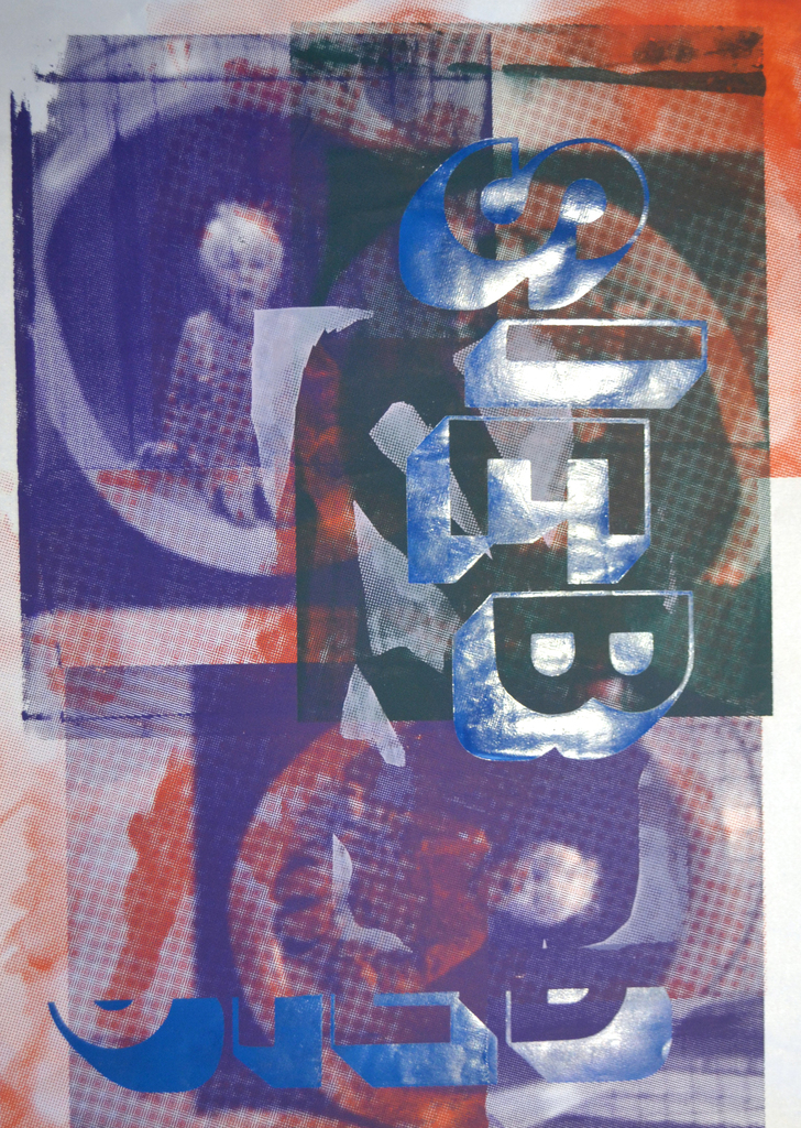 Foto Blauw Paars Groen Kind Gemengde Techniek Beweging Herhaling Letters Kleur Cirkel Zeefdruk Houten Diepte Sieb