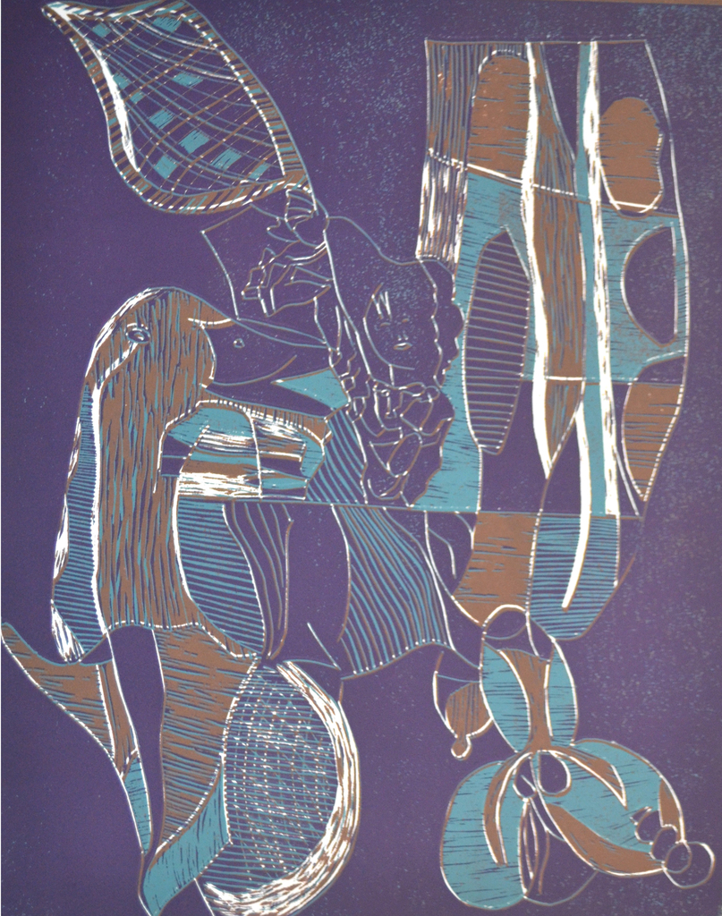 Blauw Paars Vrouw Bruin Herhaling Collage Ritme Kleur Lijnen Vormen Vlag Eend Linosnede Organische