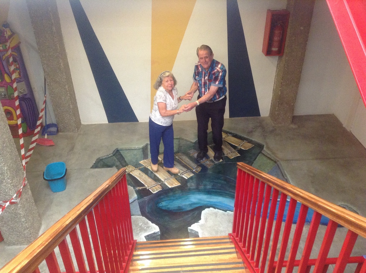 In de speel kelder van Terralta Apartementen in Benidorm, heb ik op de vloer een 3D schildering gemaakt. ik heb hem aan laten sluiten op de zijwand, daar had ik al eerder de tuin op geschilderd. Het lijkt mij leuk als de kinderen er spannende "selfie's" op gaan maken! Een leuke foto van jezelf op mijn schildering mag je altijd naar mij op sturen! links staat het gastenboek, daarop kan je mij een mail sturen, ik verheug mij erop. p.s. Mijn ouders van 89 en 90 jaar staan op mijn schildering!