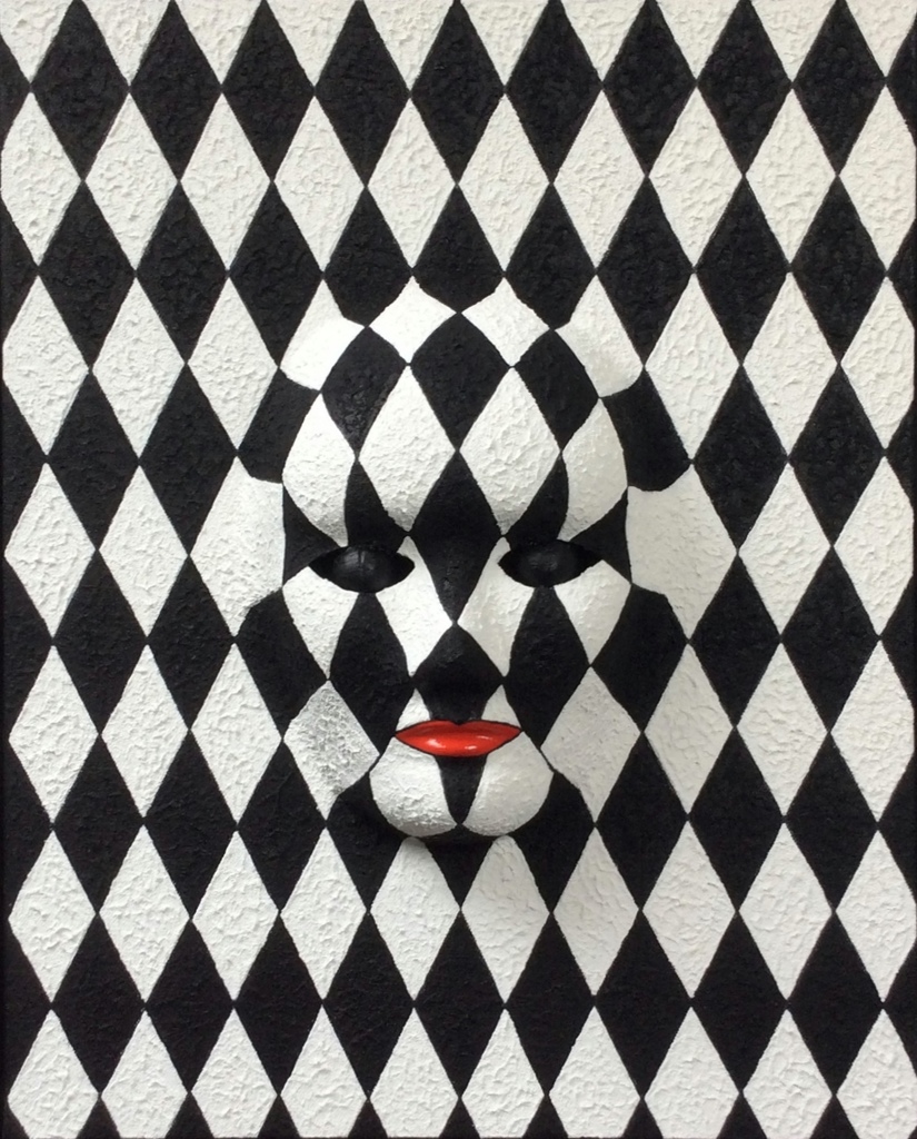 3D-kunst, gemaakt van doek en masker, bewerkt met een mix van acryl en zand. Inclusief smalle zwarte baklijst.