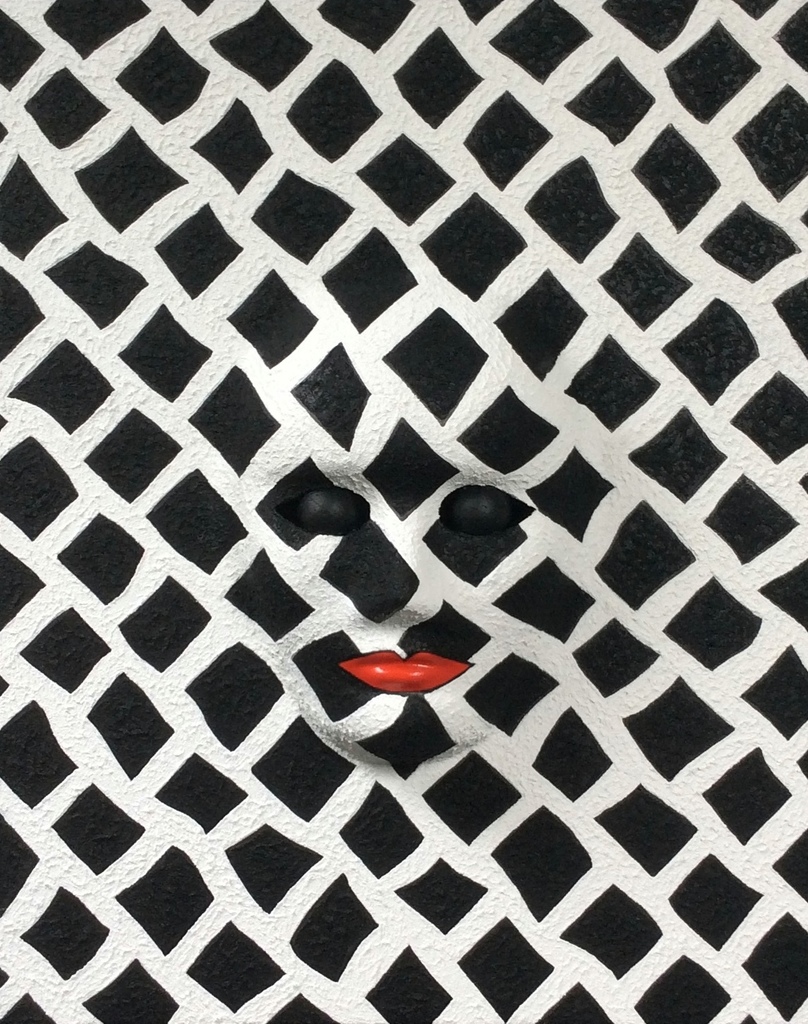 3D-kunst, gemaakt van doek en masker, bewerkt met een mix van acryl en zand. Inclusief smalle zwarte baklijst.
