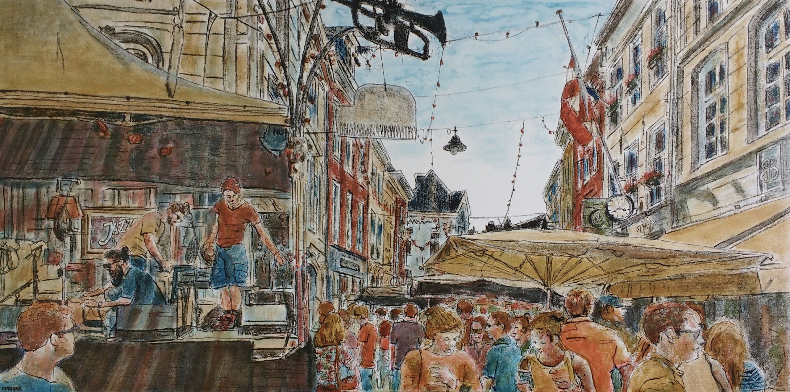 Jazz in Duketown, de Uilenburg/Korenbrugstraat in 's-Hertogenbosch. Inktschilderij, getekend en geschilderd met rietpen en penseel in meerdere kleuren inkt op linnen doek 60x120 cm.