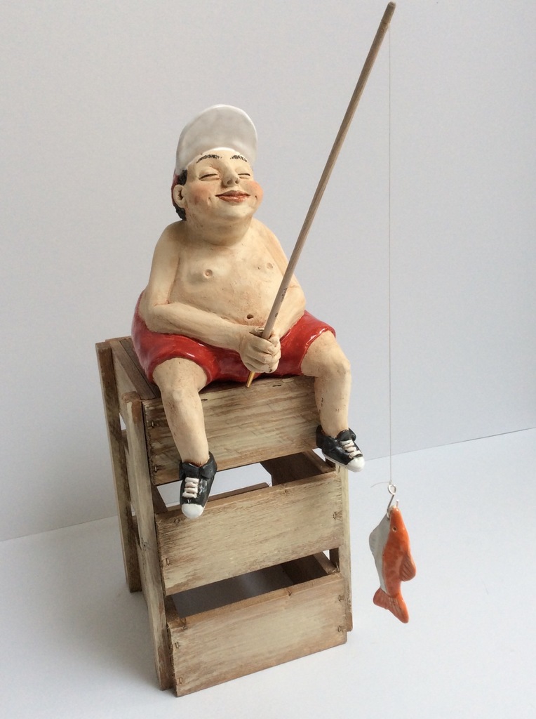 Visser met rode broek. Keramiek afgewerkt met matte en glanzende glazuur.