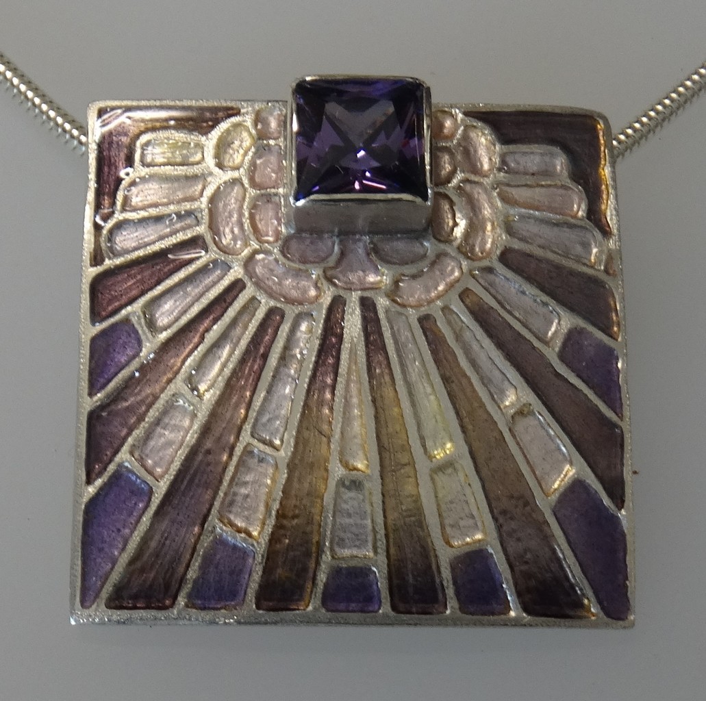 Emaille, techniek: champlevé. Met paarse zirkonia.
