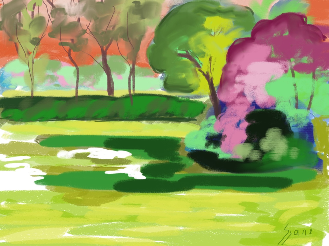 Het landschap is mijn grootste inspiratiebron. In de zomer heb ik veel buiten geschilderd. Mijn landschappen zijn kleurrijk en sterk geabstraheerd. Op het moment zijn mijn landschappen abstract.
