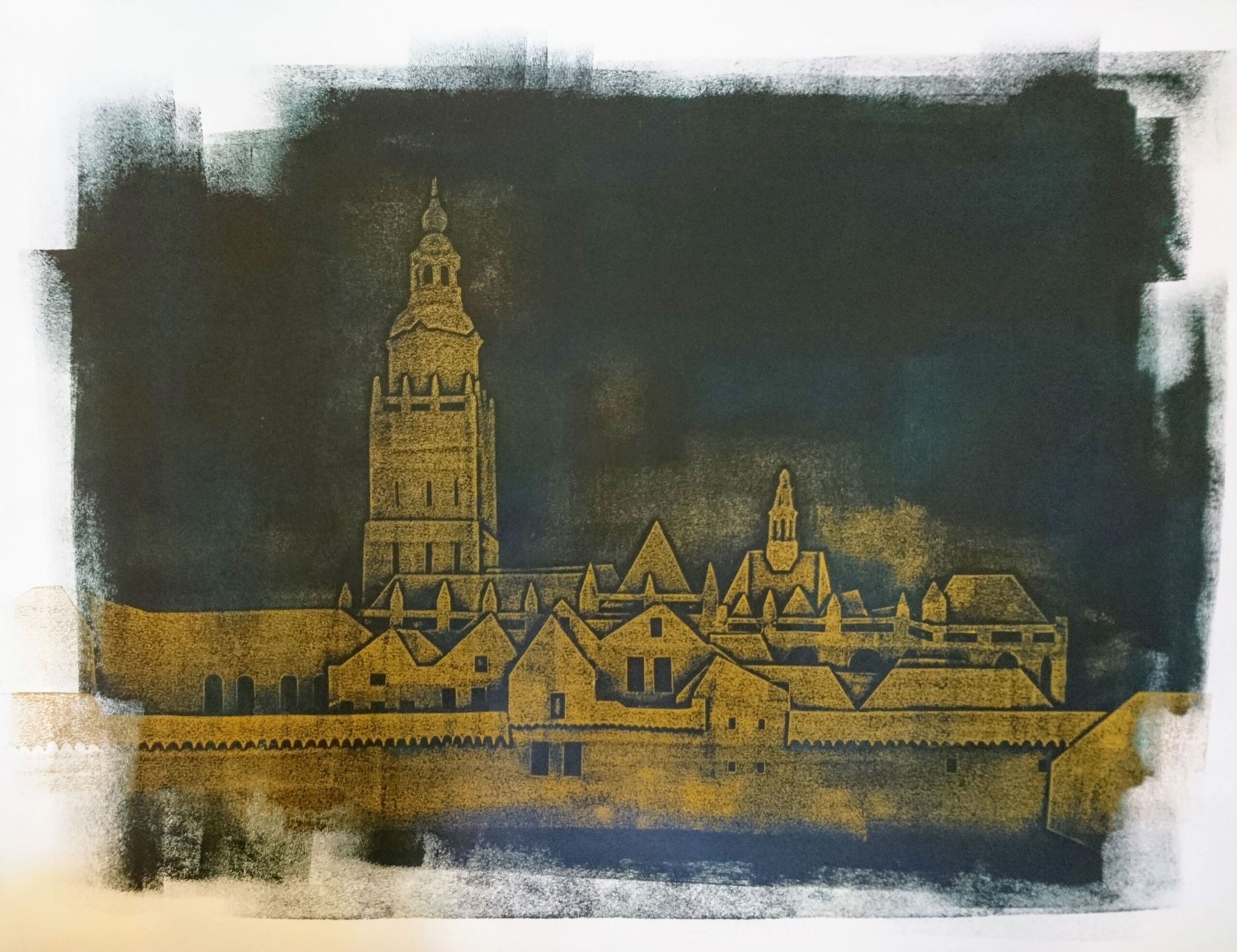 Kartondruk van het uitzicht vanuit het atelier op de stadsmuur van Zutphen, kant Martinetsingel. Met o.a. de Walburgiskerk.