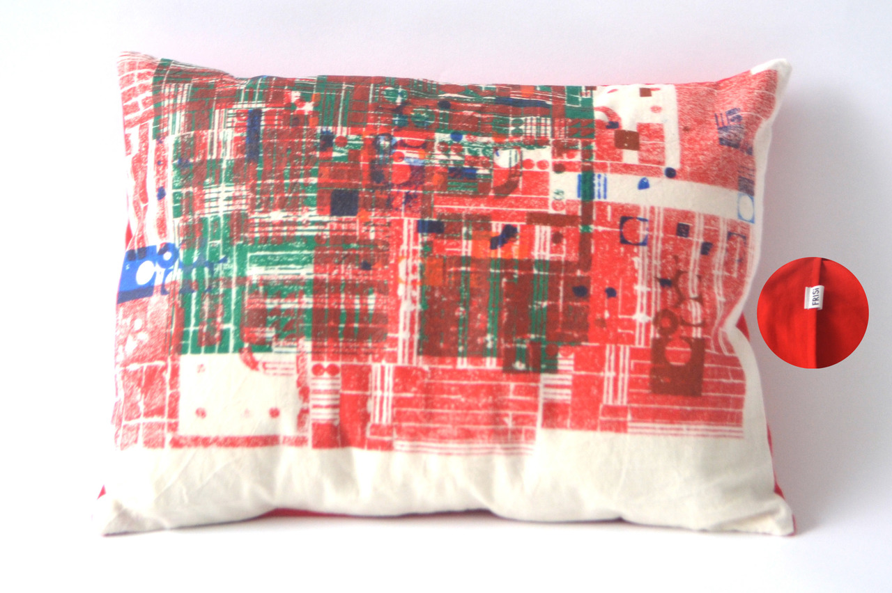 Lego druk. Achterkant van het kussen is effen rood met envelop sluiting. Kussen hoes kan gewassen worden op 30 graden.