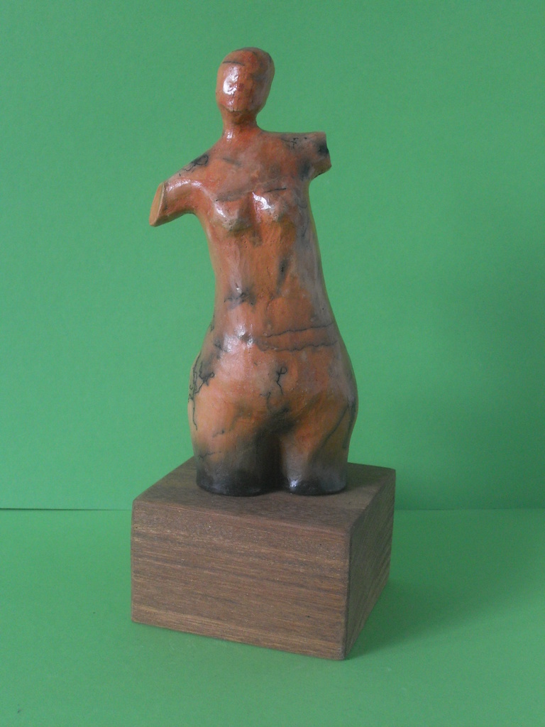 Vrouwentorso op houten blok. Ijzersulfaat met paardehaar.