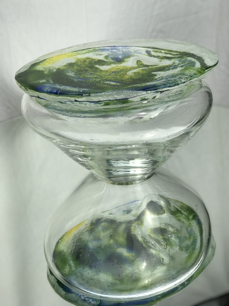Geblazen glas in combinatie met vormgesmolten glas op een spiegel gepresenteerd wat een extra dimensie aan het object geeft.