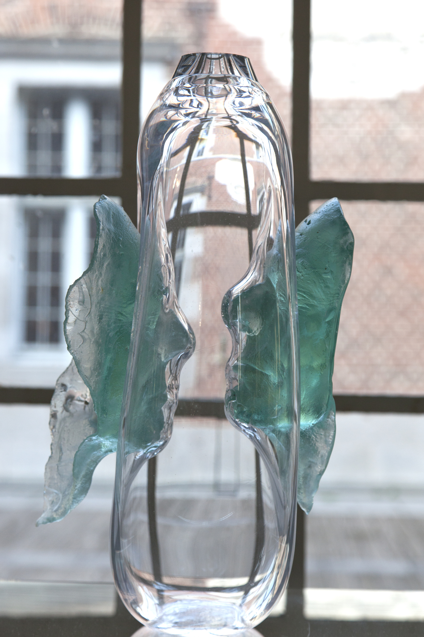Twee portretten in vormgesmolten glas met daartussen een geblazen bol.