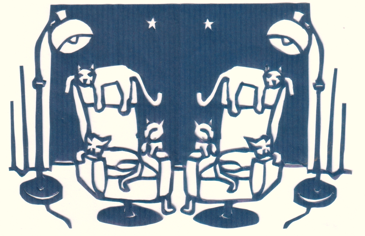 Twee schemerlampen, twee fauteuils en zes poezen...