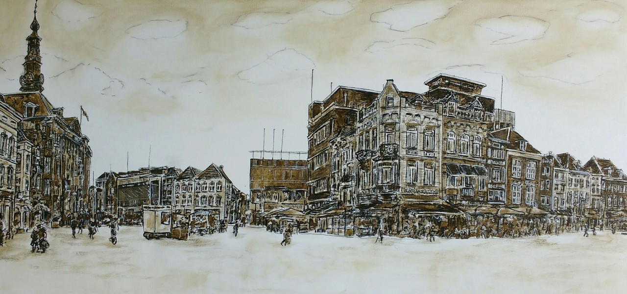Skyline van de Bossche markt, stadhuis en café's. Getekend en geschilderd met rietpen en penseel in Oost-Indische en sepia inkt op linnen doek 60x120 cm. Café's "in de Kleine Werelt", "Tijl Uilenspiegel", "Pater Noster", "het Opkikkertje", etc.