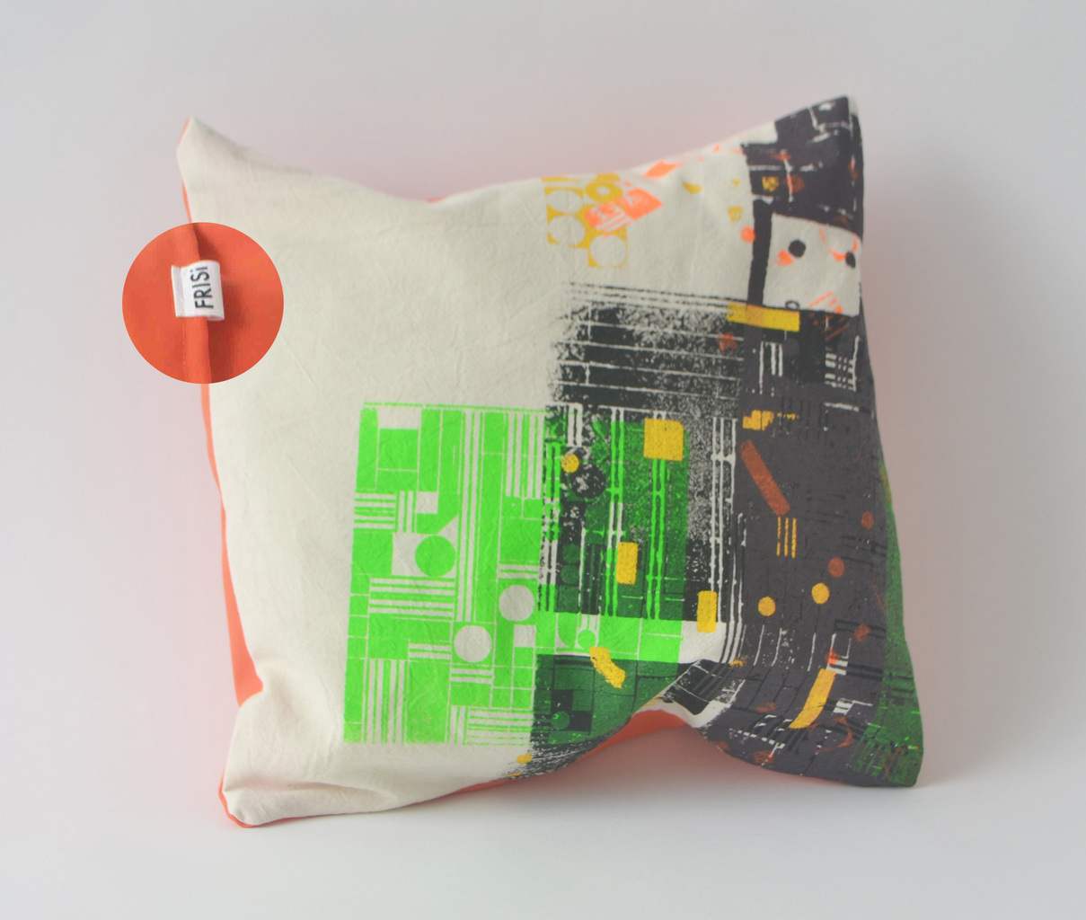 Lego druk, patronen over elkaar heen in verschillende lagen en kleuren. Achterkant met envelop sluiting kleur effen oranje. Kussen kan gewassen worden op 30 graden.
