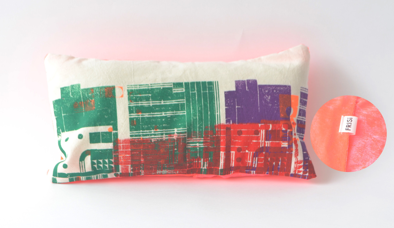 Lego druk. Achterkant van het kussen is roze /oranje gloed met envelop sluiting. Kussen hoes kan gewassen worden op 30 graden.