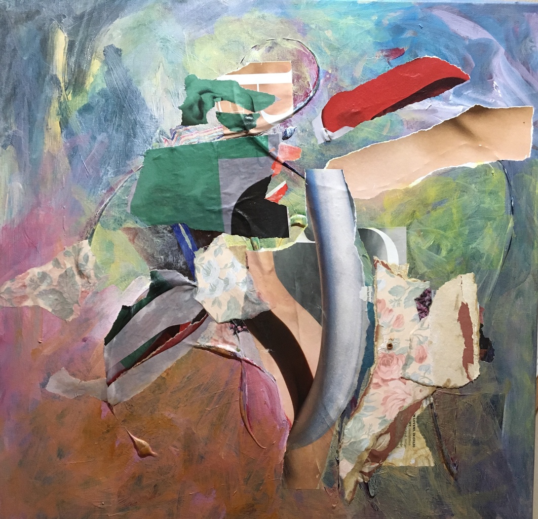 Collage, acryl gecombineerd met papier en behang. Er zit een bepaalde beweging in de compositie. Het formaat is vierkant.