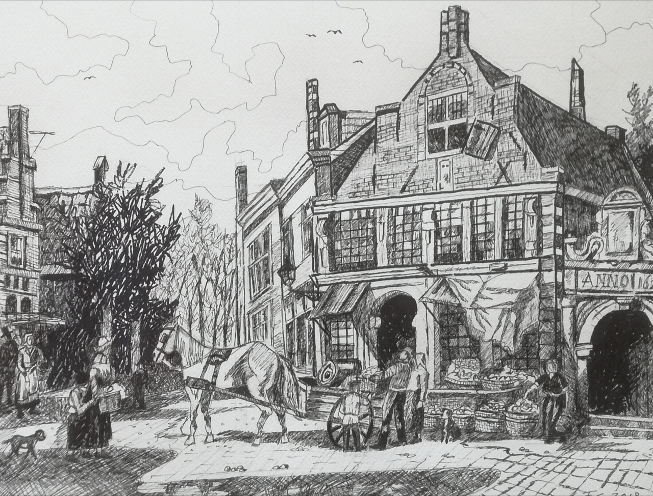 Tekening naar een schilderij van Cornelis Springer (1817-1891) voorstellend de hoek Westerstraat en Tabakstraat in Enkhuizen 19e eeuw.