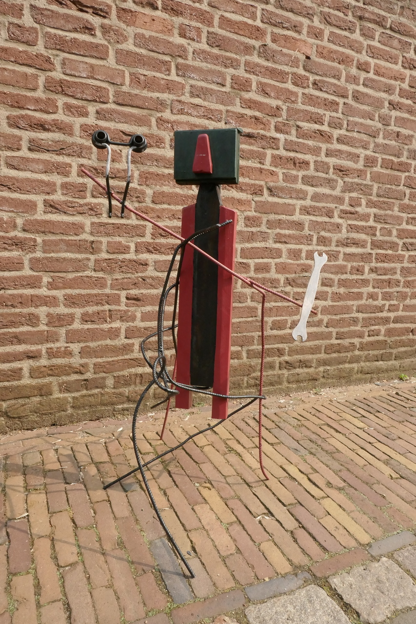 "Met goede instrumenten / krijg je alles in beweging" installatie, hout, ijzer, verf.