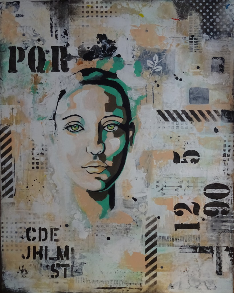 Mixed media schilderij op doek met collage, masks en stempels. Portret in acryl.