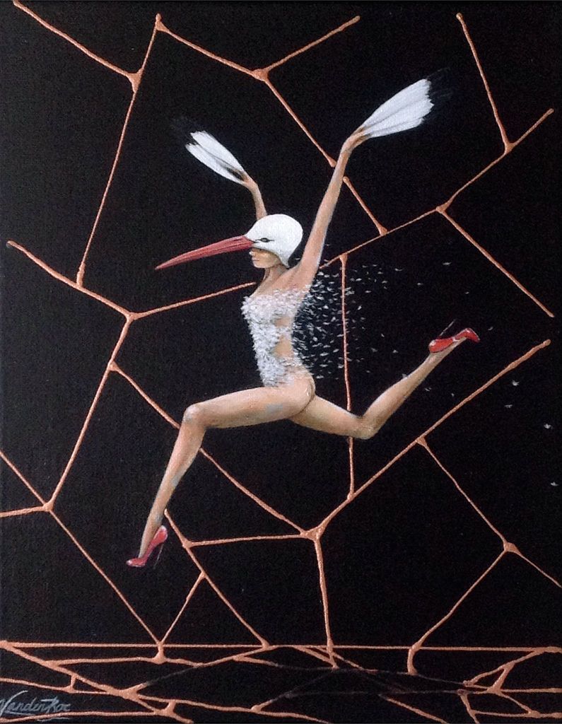 Schilderij Zwart Vogel Vrouw Koper Painting Black Ooievaar Stork Copper Rennen Running Run Birdwoman Vogelvrouw