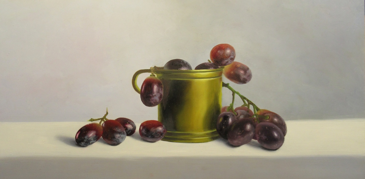 Geel Blauw Fruit Koper Stilleven Blauwe Druiven Druif Beker Messing Druifjes Drinkbeker