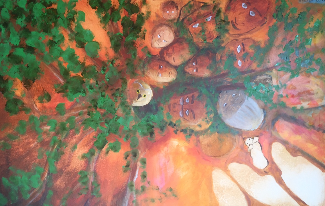 Het originele schilderij hangt nu onderste boven en had vele ovalen waardoor ik geïnspireerd raakte om gezichten te schilderen.