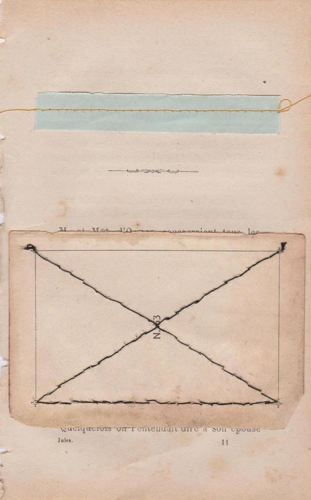 Bladzijde van een oud boek. Collage en draad. Werken uit een serie.