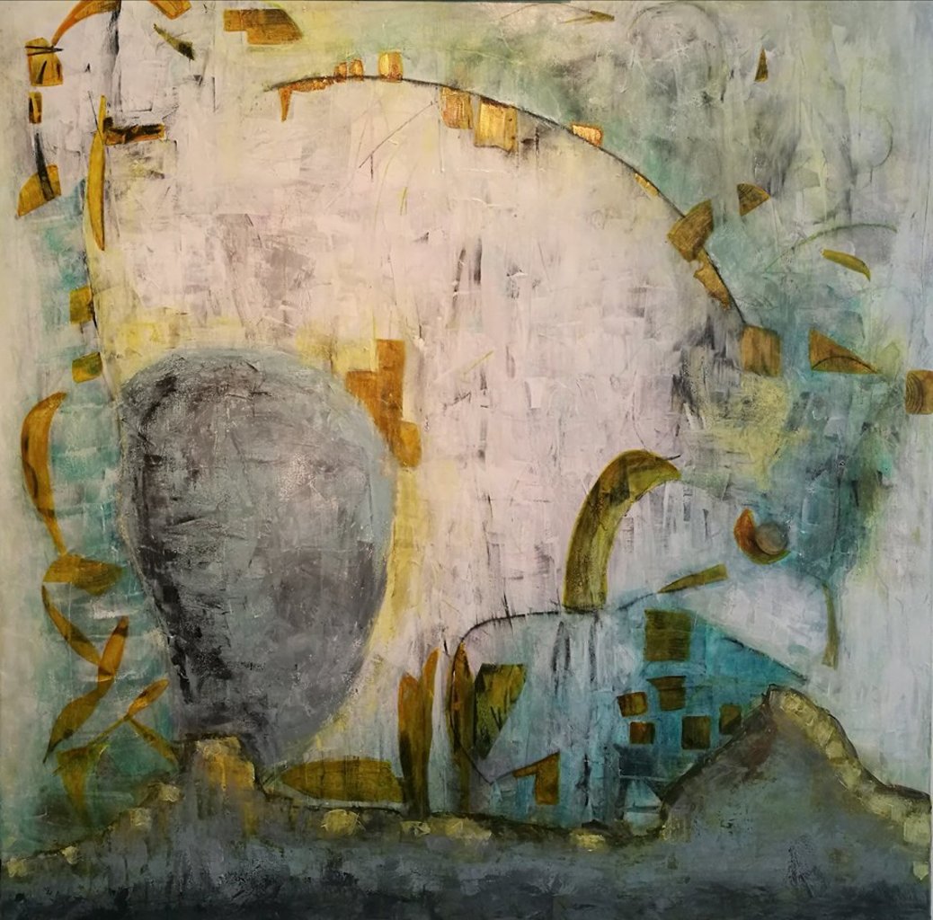 Intuitief Gelaagd Wit Blauw Grijs Geel Mixed Media Abstract