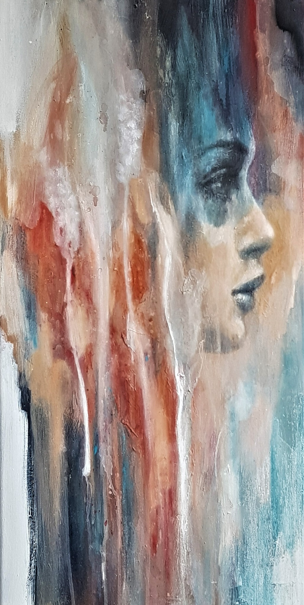 Schilderij Acryl Mysterieus Vrouw Portret Kleurrijk Gezicht Doek Houtskool Kleur Expressionistisch