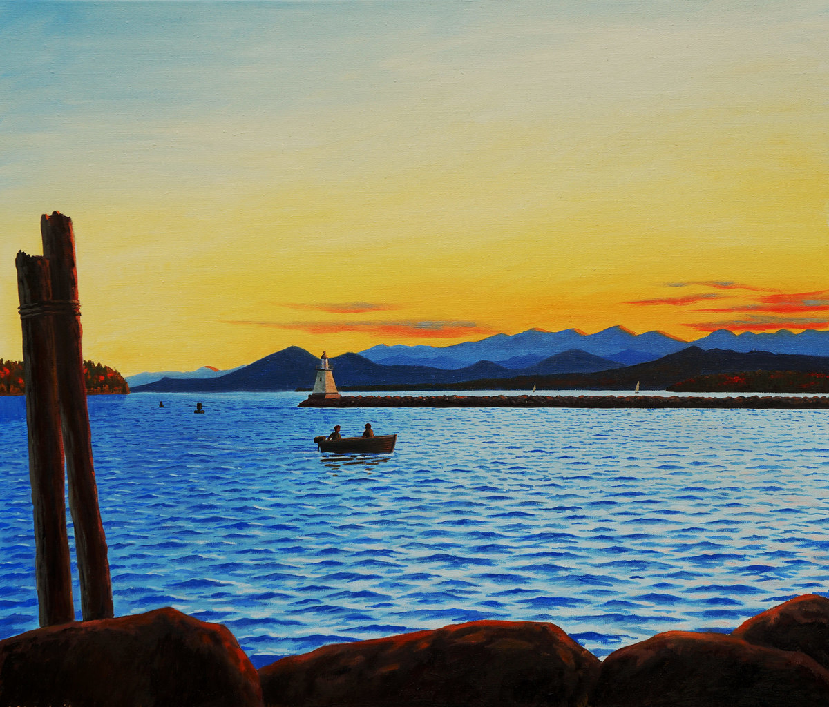 Avond Evening Schilderij Painting Kunst Art Vs Amerika America Boot Boat Zonsondergang Sunset Realisme Realism Figuratief Figurative Water Bergen Mountains Zomer Summer