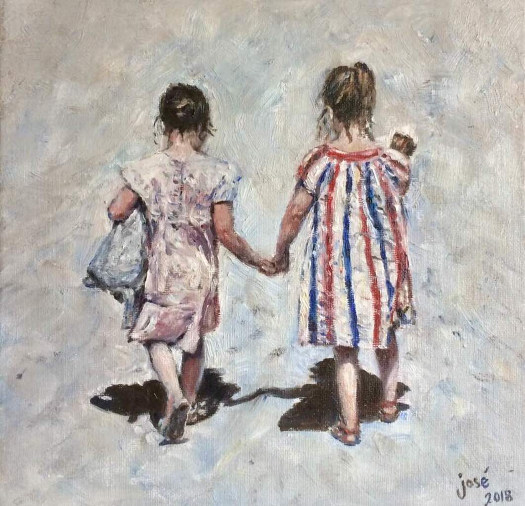Twee kleine meisjes hand in hand op weg naar de toekomst.