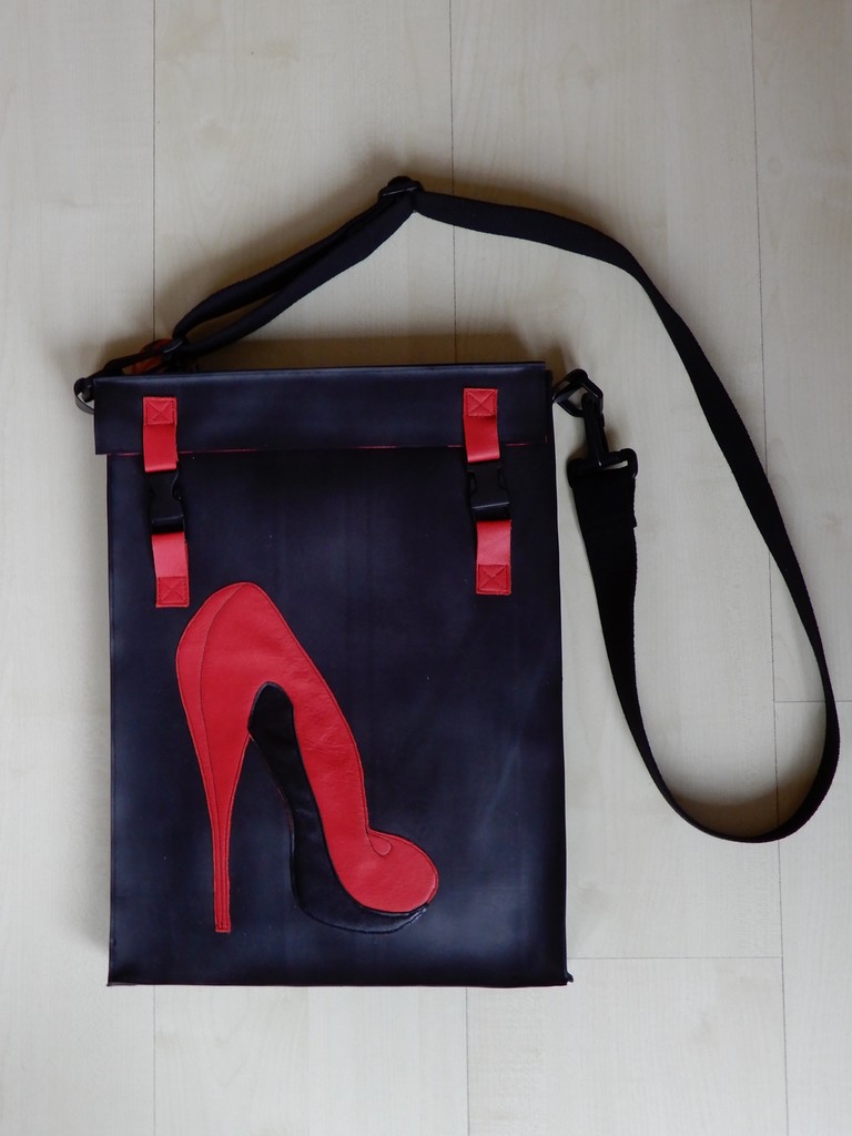 Tas van vijverfolie met leren applicatie.