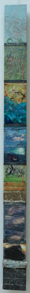 Ik ben een materialen mens, en maak samenvoegingen van verschillende materialen; foto’s, stoffen en borduursels, soms ook gecombineerd met hout, lood en steen, op wisselende formaten