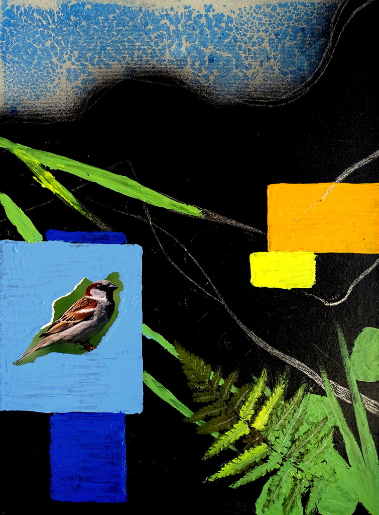 mixedmedia in acrylverf, fotografie, goudwax-stift , varenblad op doek. Niet te koop.