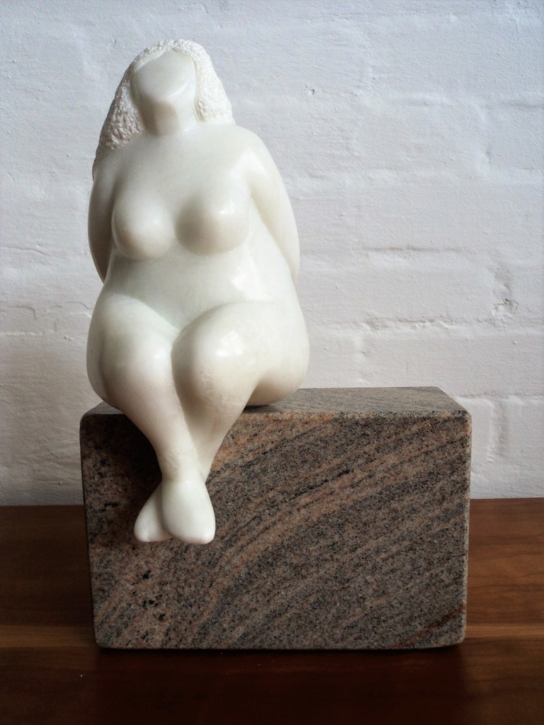 Een volle zittende dame van wit speksteen op een sokkel van graniet. Verkocht.