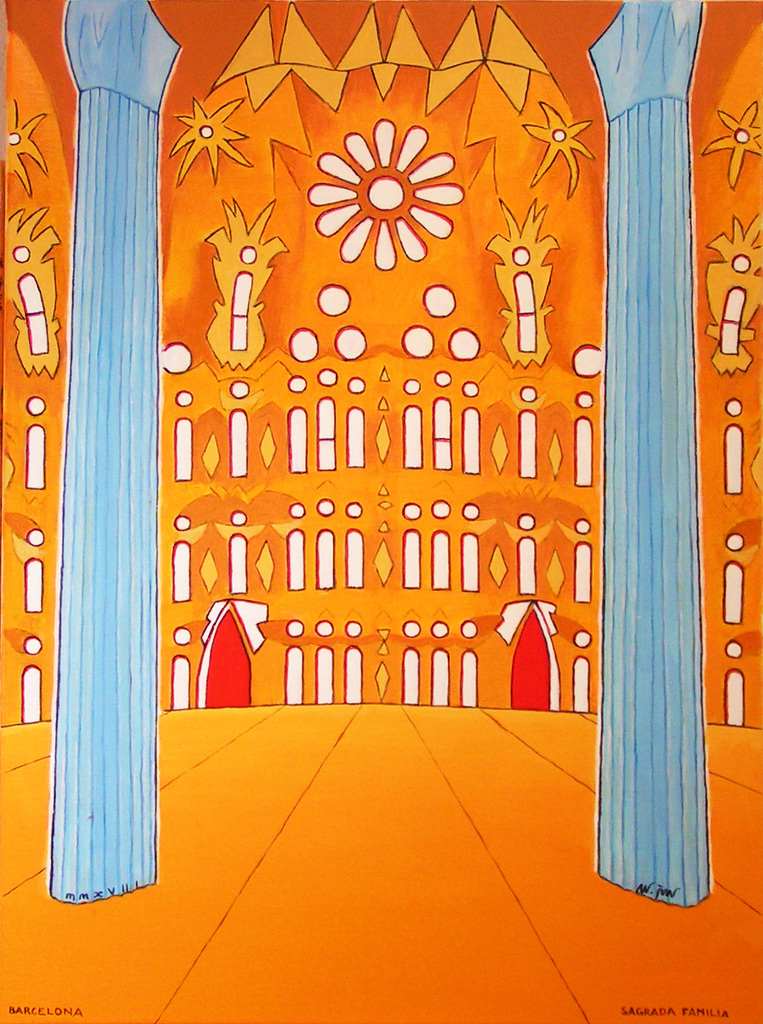 Het prachtige interieur van de Sagrada Familia, de kerk in Barcelona van Gaudi die nog steeds niet af is.